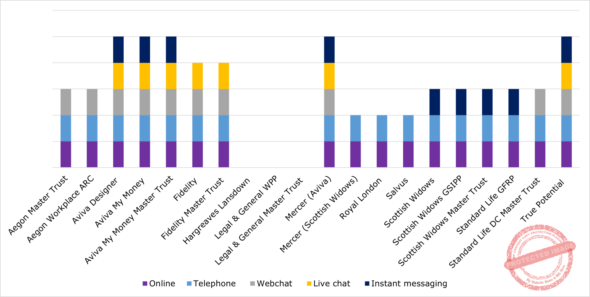 When it comes to communicating with their members who have questions about their financial wellness proposition, email (85%) and telephone (85%) communication are the most common forms of support for workplace pension providers. Webchat is also surprisingly well supported with over half (55%) of providers supporting this. Around a third (35%) of providers support live chat for their financial wellness support, and 40% of providers offer instant messaging as an option.