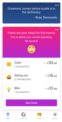 One of the great things about Emma is the smart messaging and alerts. These features really help the user manage their money better not only in ensuring they are not in debt but also, so they are able to save money at the same time.