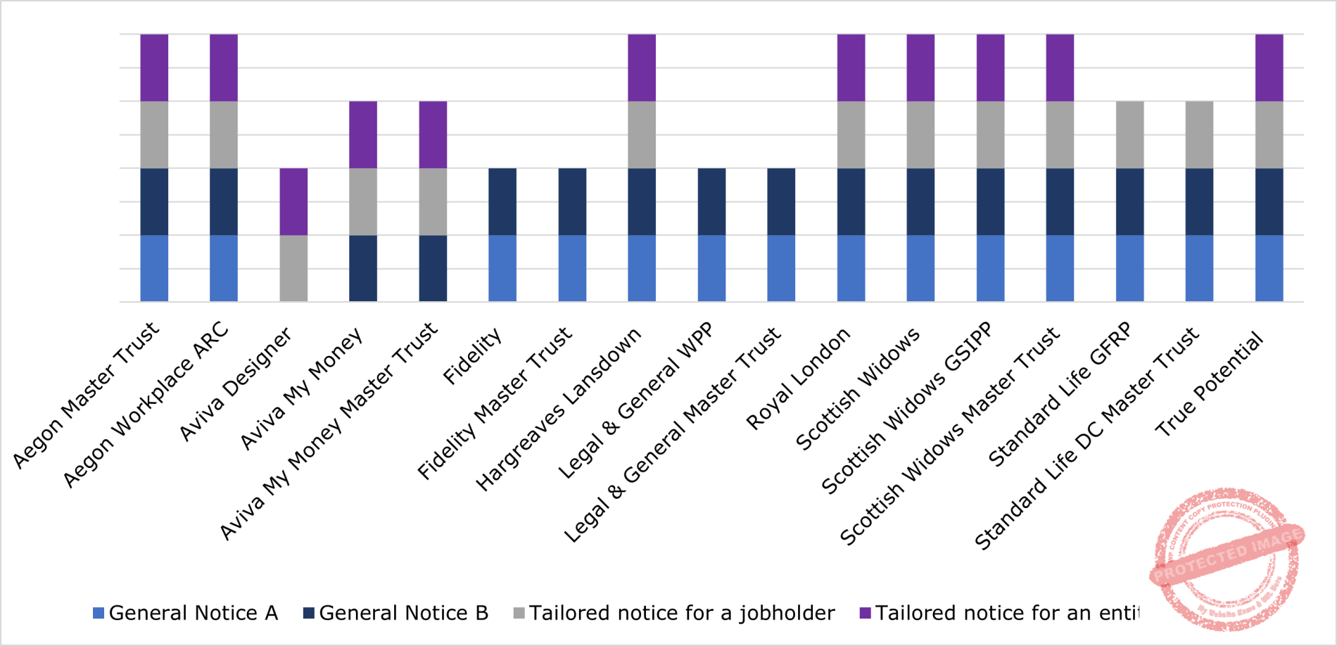 Continuing from Tuesday’s insight looking at postponement, our analysis shows that general notice A postponement notices are fairly well supported by workplace pension provider systems. Only Aviva Designer, Aviva My Money and Aviva My Money Master Trust do not support them. For all other providers the process is automatic and requires no human intervention.