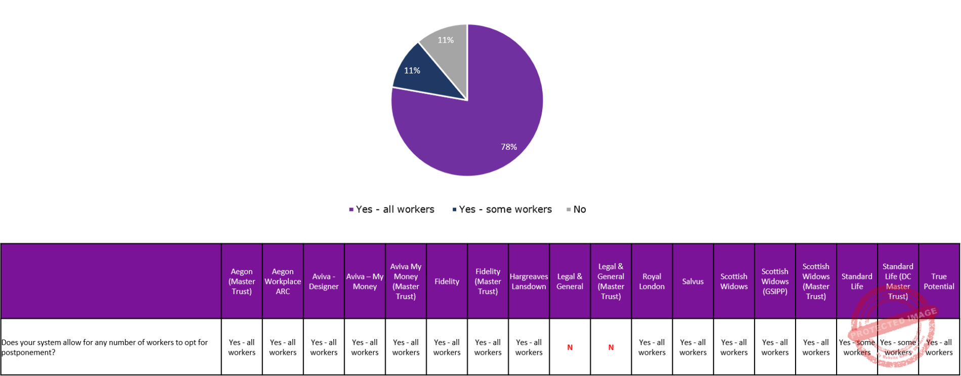 Overall, our data shows that workplace pension provider systems are, as a whole, supportive of postponement. However, it is worth noting that Legal & General and Legal & General Master Trust do not allow workers to opt for postponement and also have the least options available when it comes to what kind of postponement notices their system can generate.