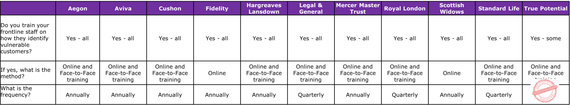 Our data shows all workplace pension providers train their frontline staff on how to identify vulnerable customers. Most do this through a combination of face-to-face and online training. Fidelity and Scottish Widows conduct all their training online.