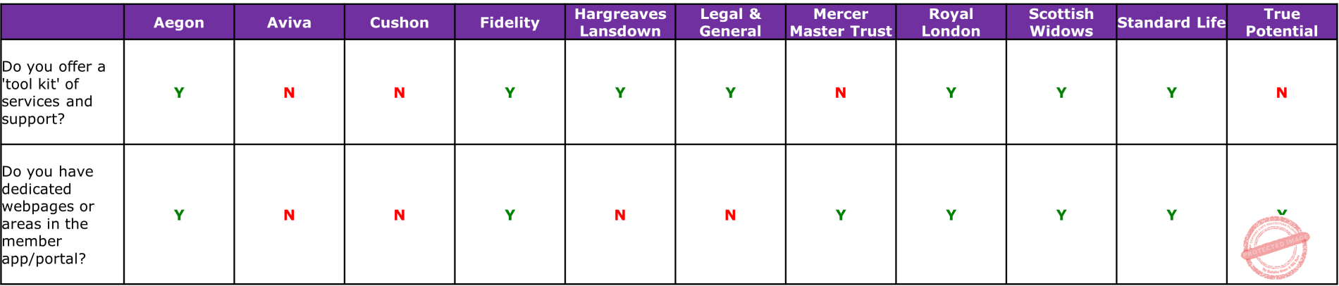 Two third of providers have also confirmed that they offer a ‘tool kit’ of services and support. The only two providers who currently do not are Aviva and Mercer Master Trust.